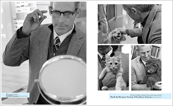 The 2010 holiday ad campaign that I shot for La Encantada, an upscale open air mall in Arizona, illustrates the story of a dapper man-about-town as he picks up last minute holiday gifts for his family… and himself. Our hero, dressed in a Brooks Brother’s suit, stops at Tiffany & Co. where he buys a huge, four carat diamond anniversary ring. After that, he decides he could use a drink, and a smoke, so he stops at a wine bar, removes a Cuban from his Tommy Bahama cigar case, and enjoys a glass of fine brandy. He chooses a new pair of specs, straps a holiday wreath from the Pottery Barn on his vintage Mercedes, and heads off into the evening with a new found friend from the Humane Society.